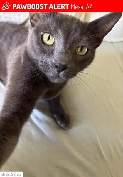 Smooth gray coat. Citrus green eyes. Small bump on head from big bone. About 4 years old. Indoor cat that scratched through screen window and wondered off in the night