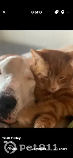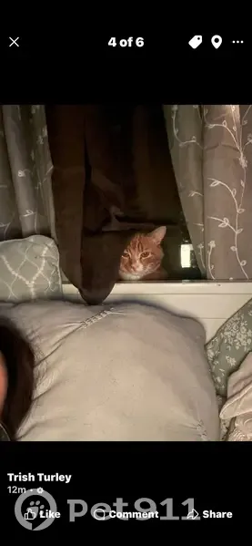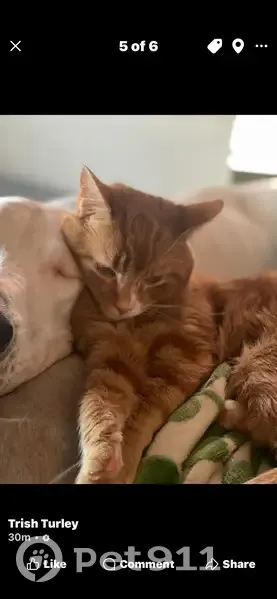 Very friendly, white on chest and some on chest and tip of tail orange tabby, male, not neutered, 6 years old. Has asthma, often snotty very soft (squeaky like) meow