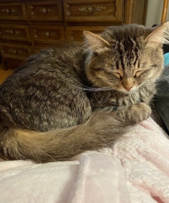 This is my mom’s Indoor cat and he ran out of garage door while she was unloading grocery’s from her car. He is a tabby color, has a bushy tail and is on the smaller side. He is probably so scared he’s just hiding.