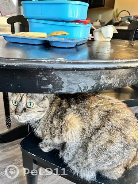 Slimmer maybe 8 lbs, has some orange markings. A couple of her paw pads are pink. She’s friendly but fast and probably scared.