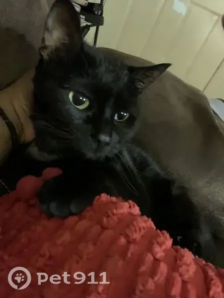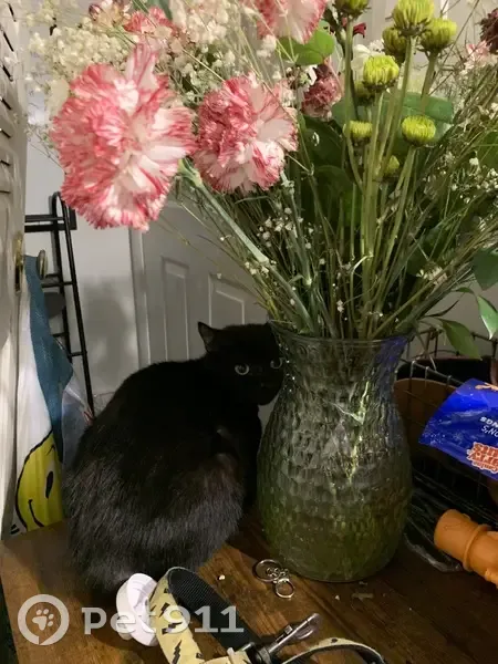 Small black cat usually pretty nice sometimes it gets scared and feisty. She usually has her collar on, but sometimes she’ll take it off on her own. She has small hair loss around her ears and top of the head and back hind legs. She was getting treatment before she disappeared.