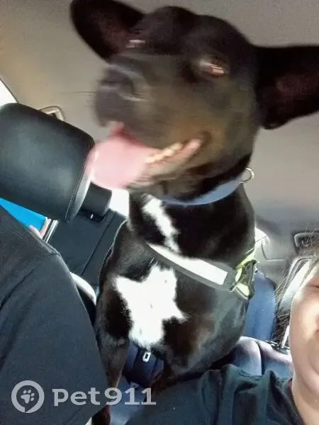 Black dog with white on his chest. Has floppy ears that don't fold all the way down. He likes to give hugs and will try to stand like a human to get treats. Barks when he wants something. Scared of cats.