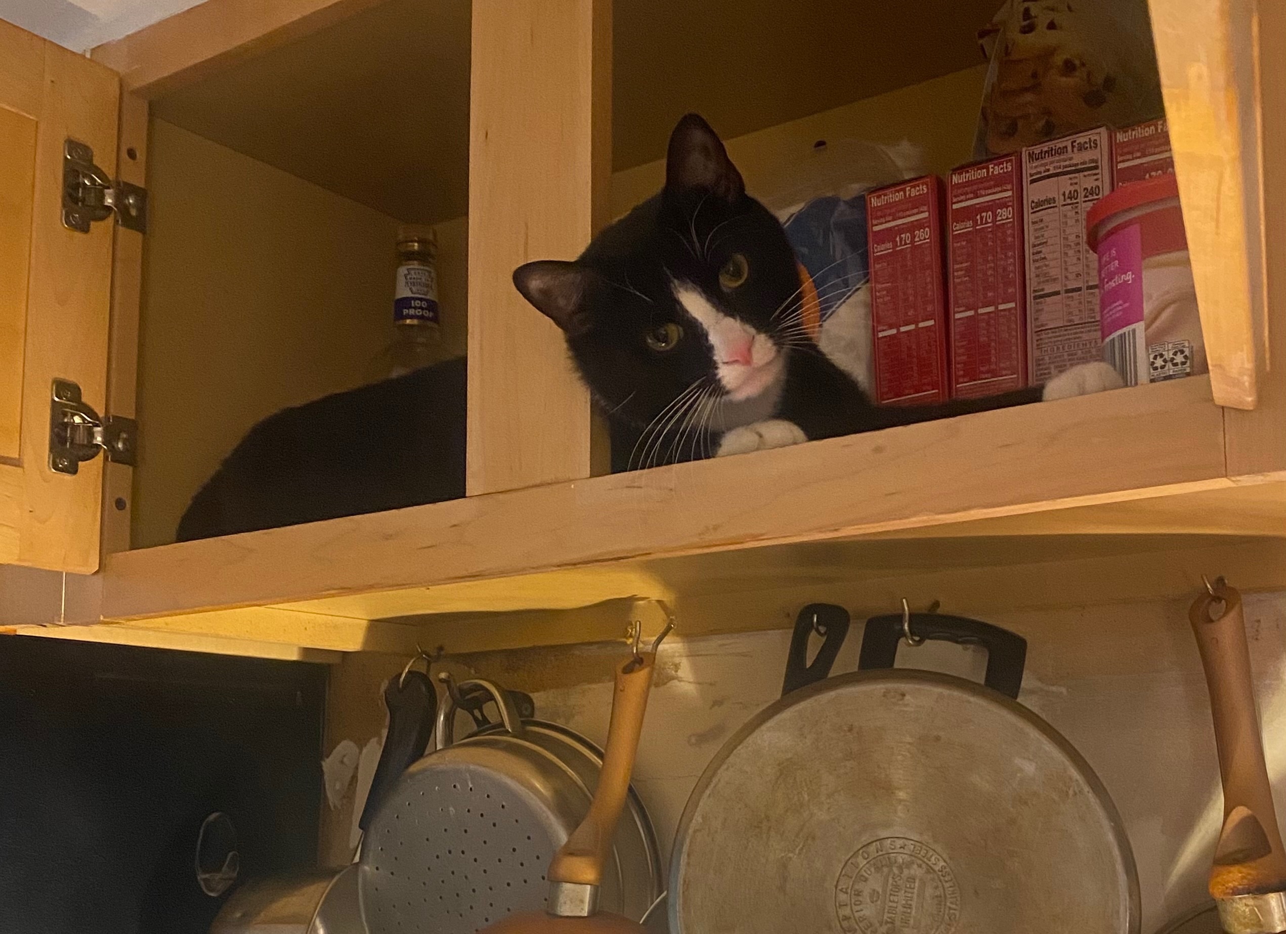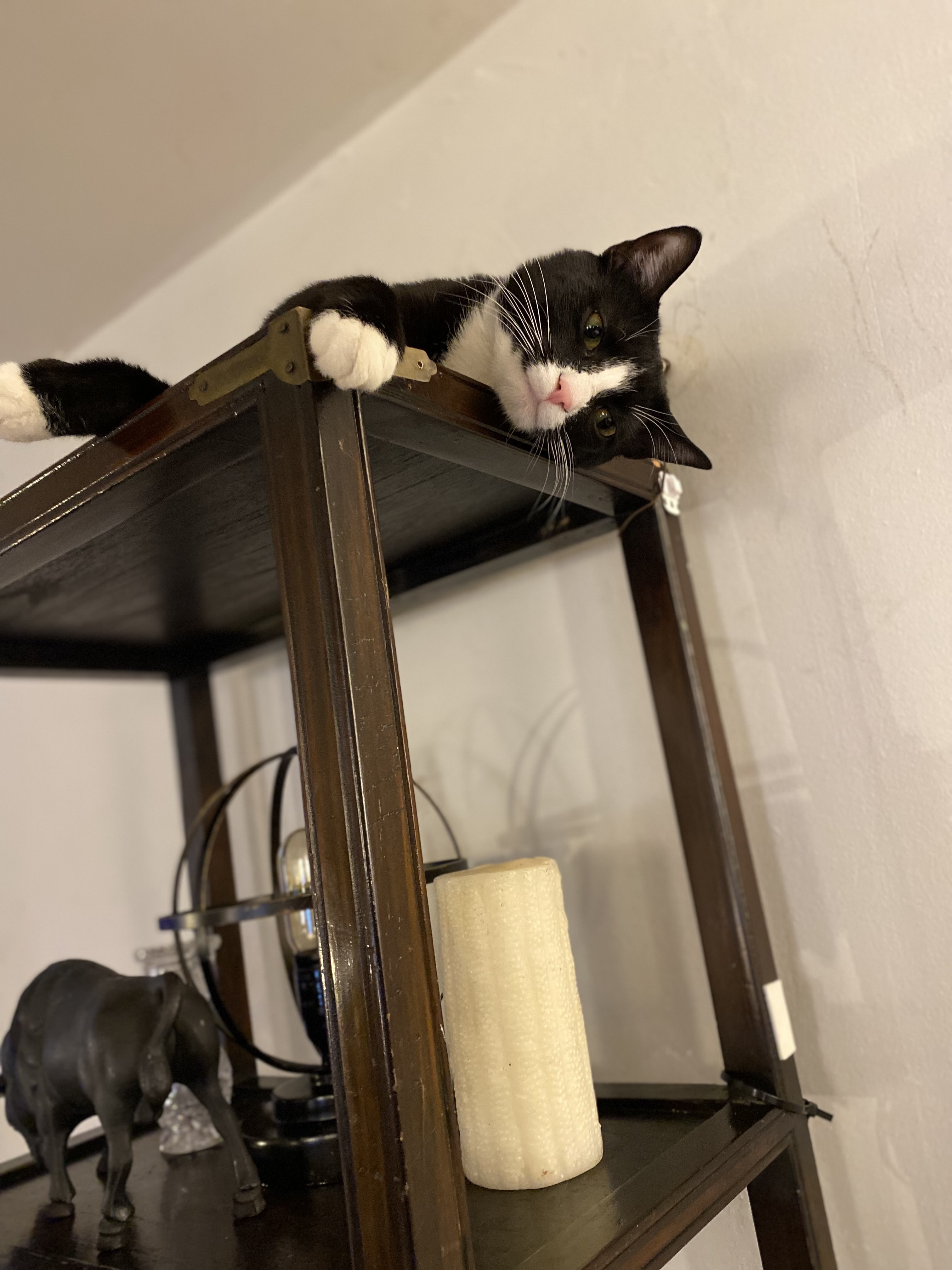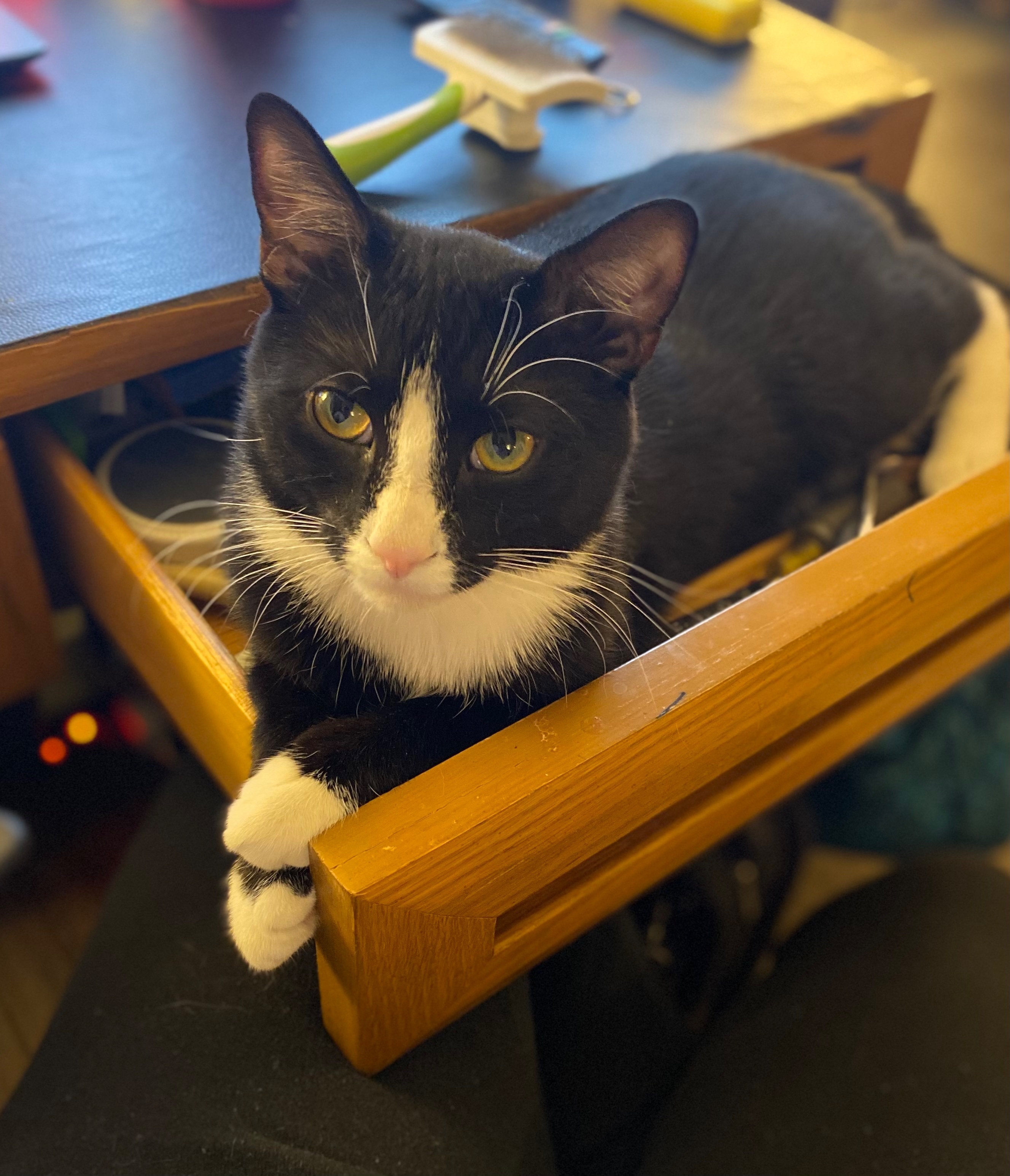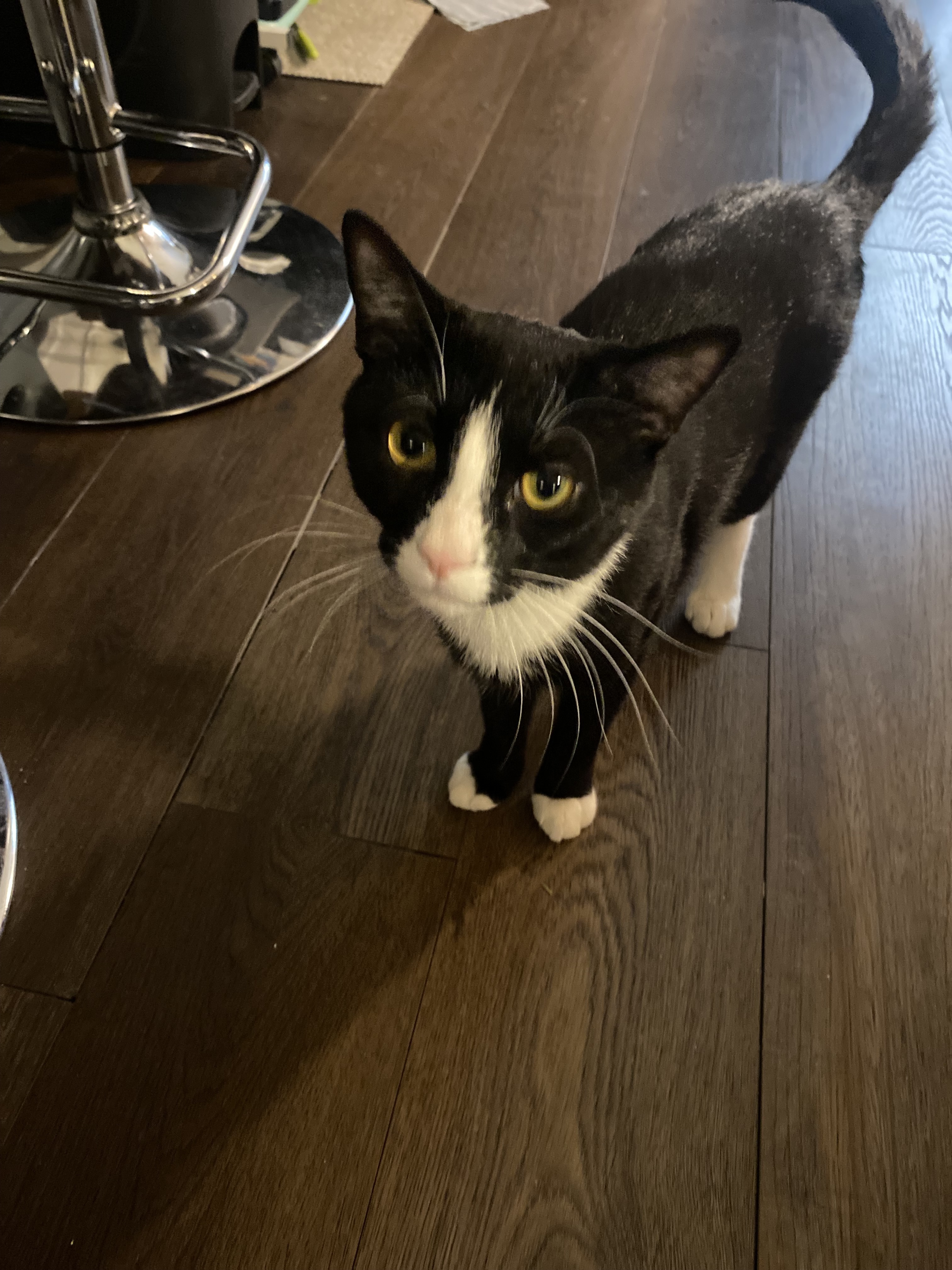 Jack is black and white tuxedo cat. He has narrow white down and under his pink nose. White belly. White chest and one of his front paws has a little more white than the other. One pad also has a heart shape. On the back left pad i believe. Half a heart. Because i have the other half. I miss him and i'm so scared for storm. I have not slept. I want him home