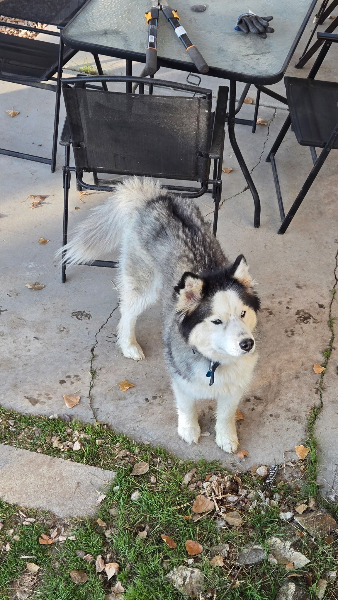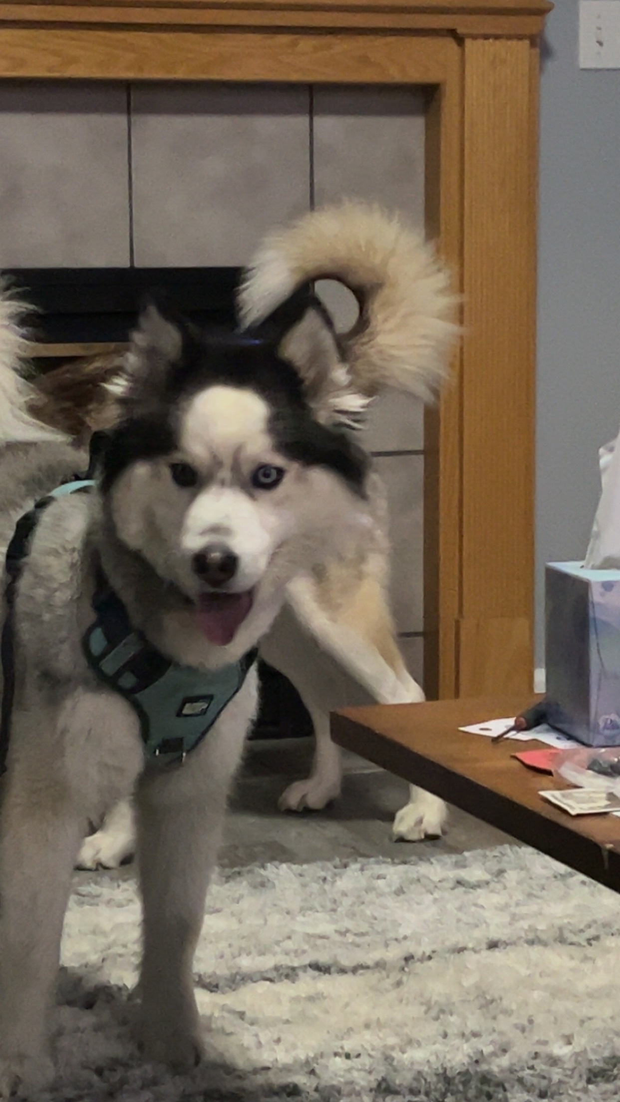 He's a light black and white husky with blue eyes. He has an eye with a darker blue area that makes him look like he has two pupils. His coat is shorter than what it would usually be on a husky.