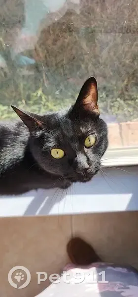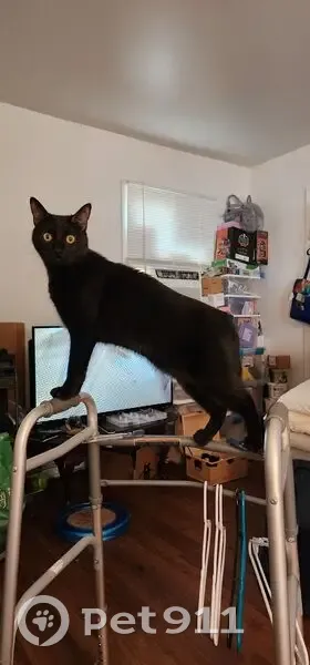 He is a seizure alert cat. Black coat redish undercoat, yellow green eyes, 12-14 pounds, loves scratches, friendly, house cat. Recently moved to Coleman Texas. He got scared out door when trash was taken out. Has chip.
