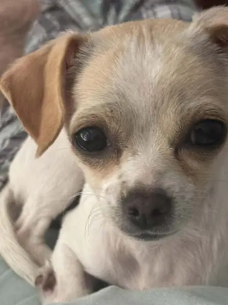 White, elderly dog. Quiet, nice, potty trained, unbothered by other dogs. Seems like she’s been in the streets for a while, long nails, soaked in urine, scared.
