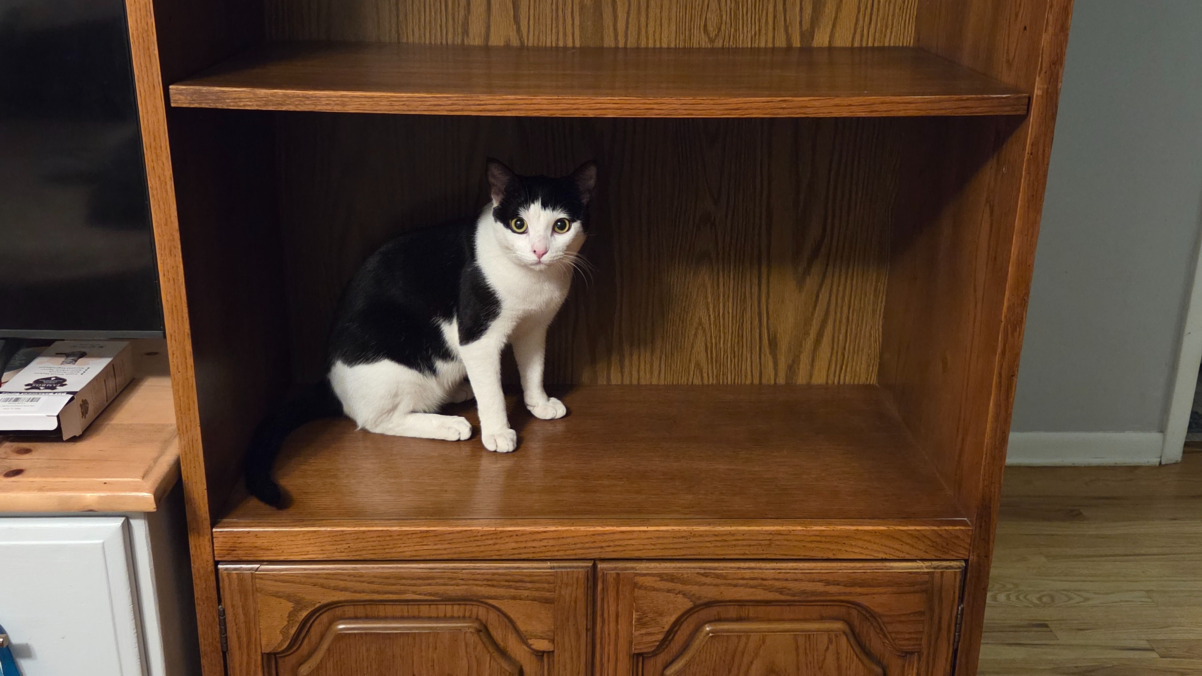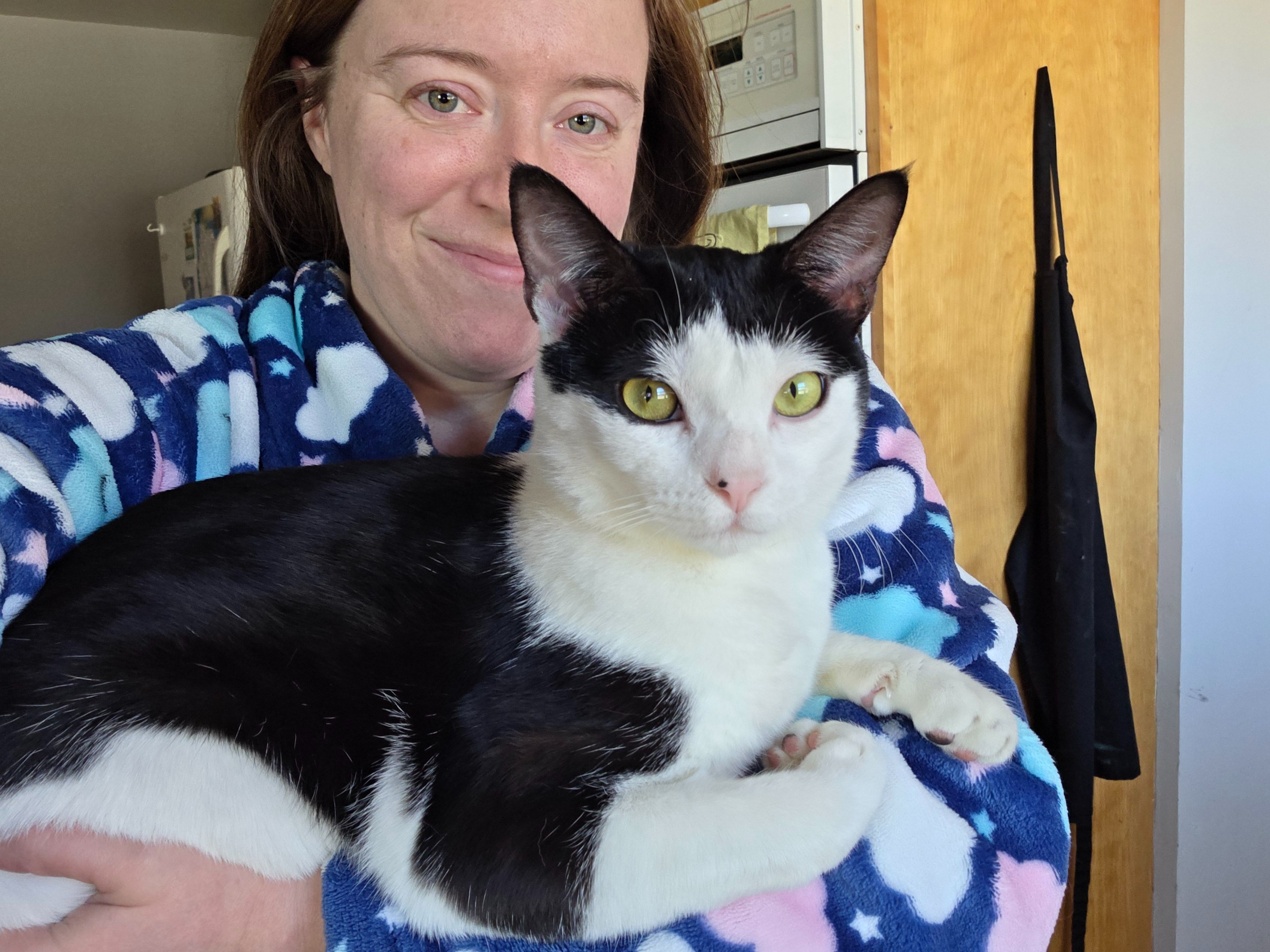Black and white, yellow/green eyes. He might answer to his name, but he's a pretty wild guy, he may not be interested in people. He LOVES food, so something that smells strong might draw him in.