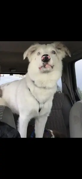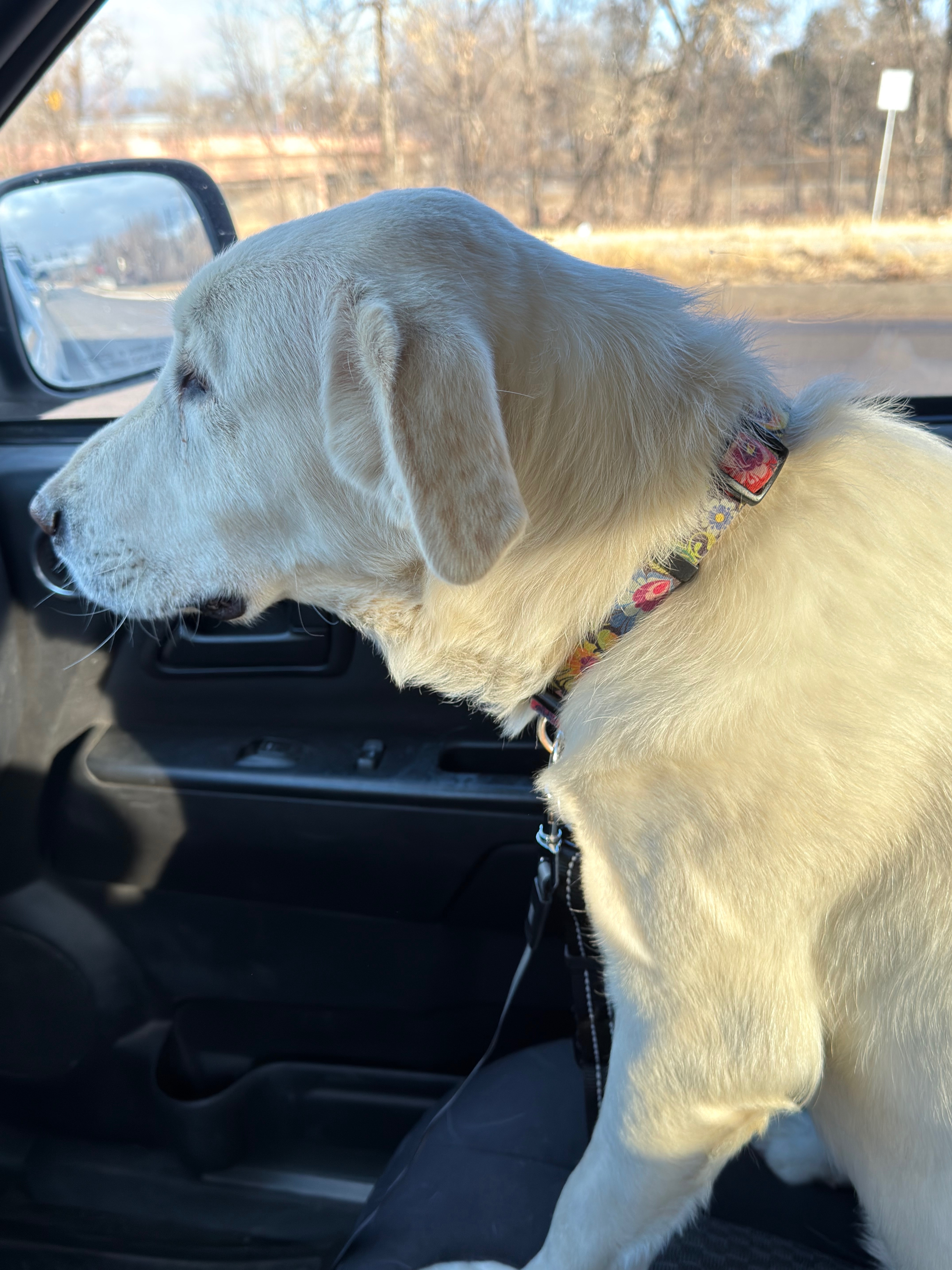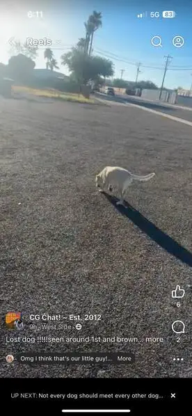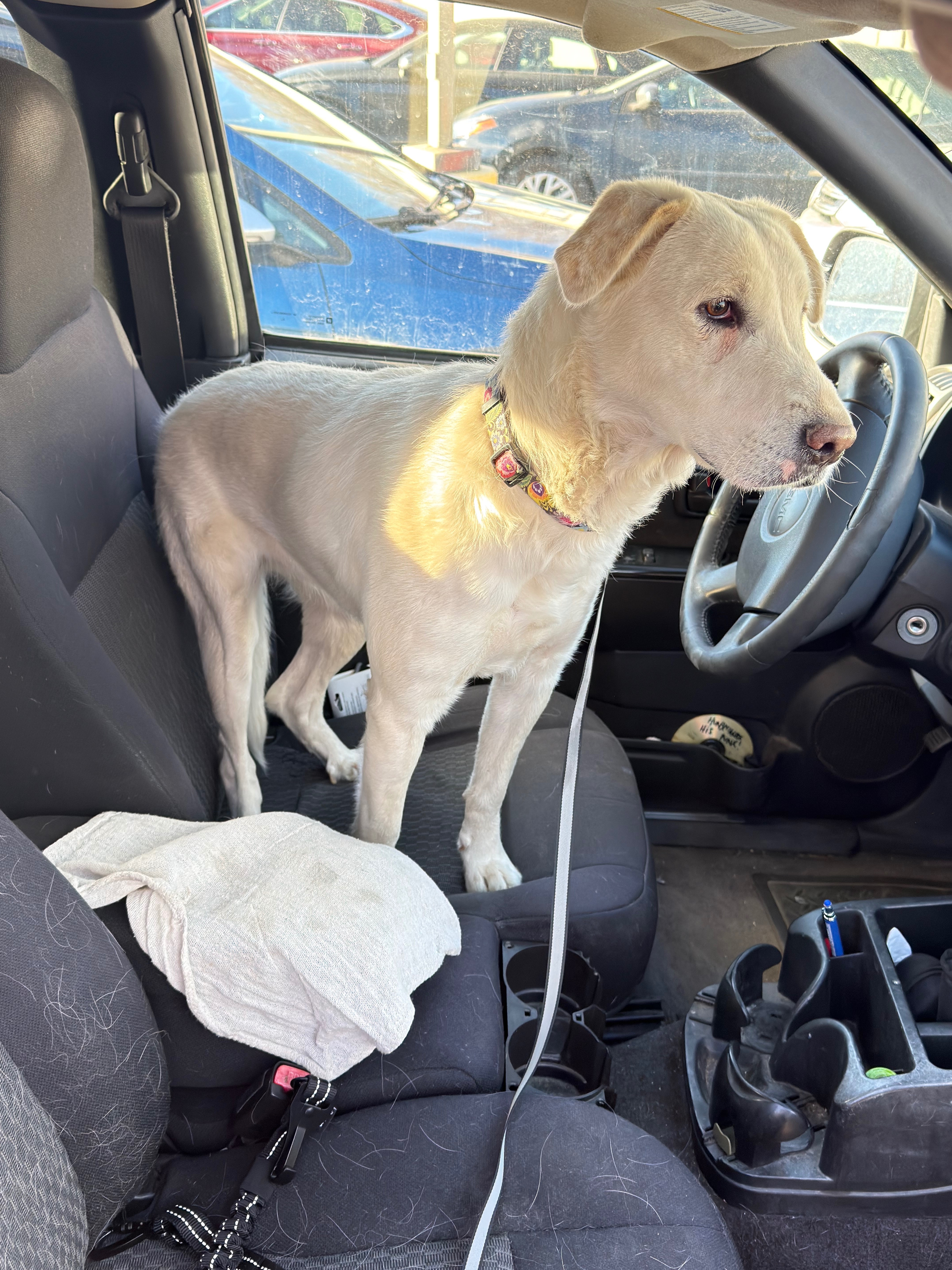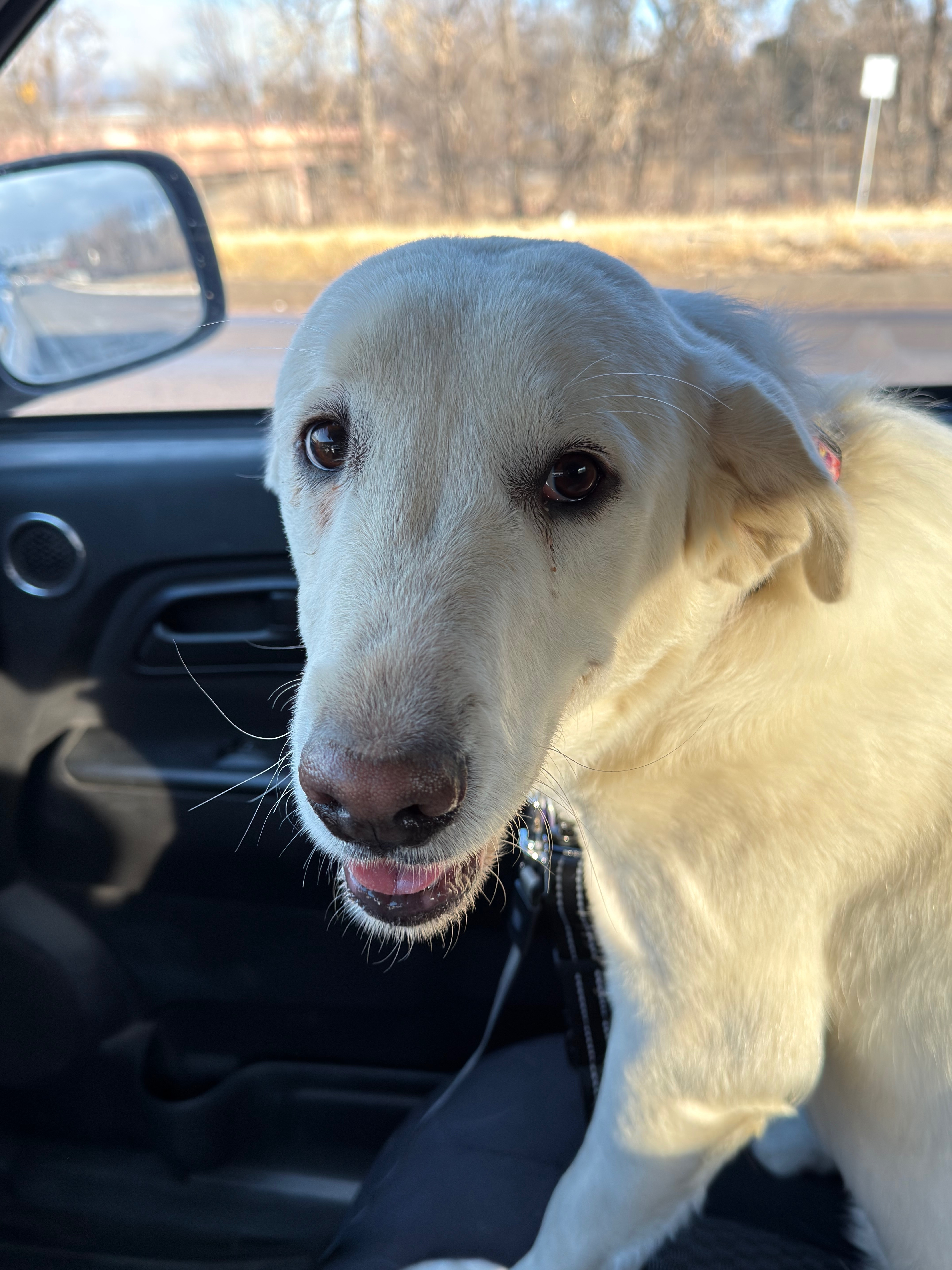 White-ish in color, very friendly once I was able to catch her, she had no collar and no chip. She’s currently at the Humane Society in Colorado Springs.