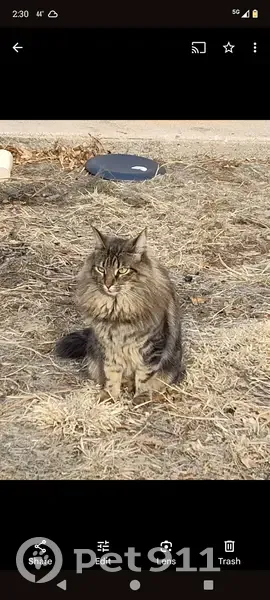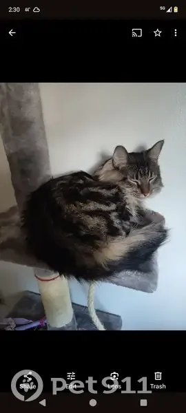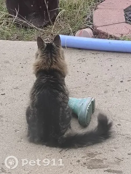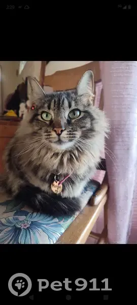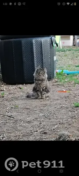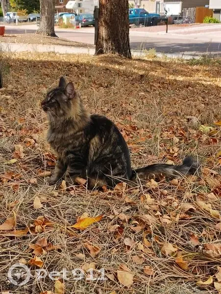Small female 3 yrs old cat. Green eyes, brown, black and grey coloring with tiger stripes. Very sweet and can be vocal with loud chirps and meows. Very timid and shy and will most likely run. Loves tuna.