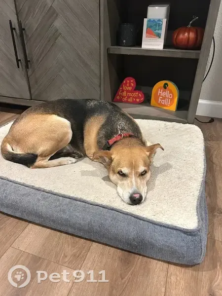 Very friendly well behaved but lots of anxiety. Red collar and a sore on his nose. When he was last seen he had a slight limp. Black back with brown head and legs and a white belly and muzzle.