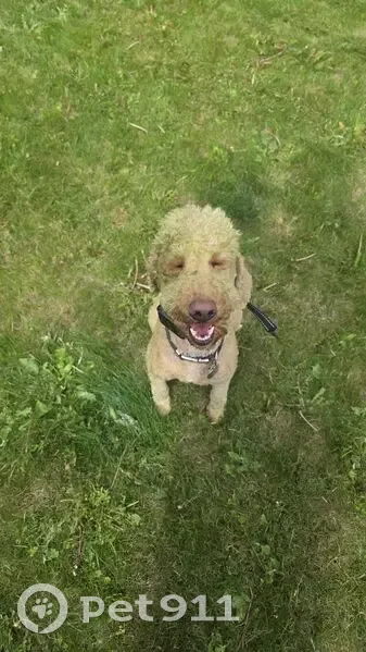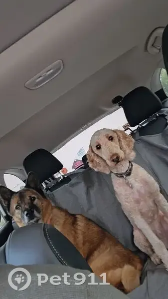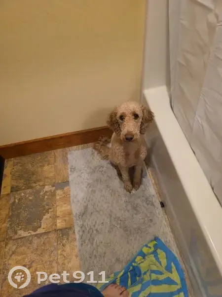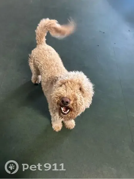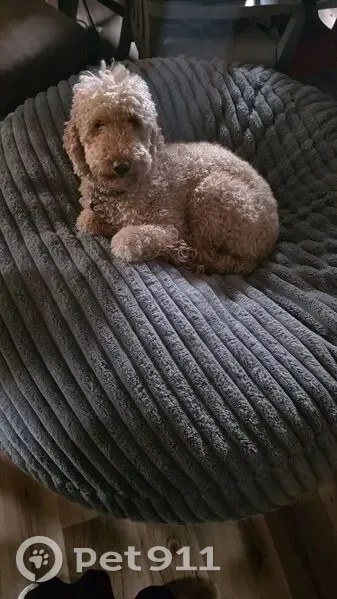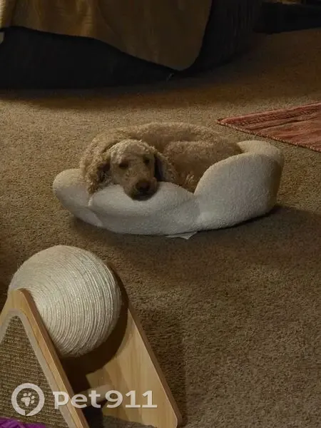 Loki is a tan/gold 35lbs golden doodle. He can be skittish and weary of new people and other animals but is otherwise a sweet boy. His collar is dusty blue suede/leather with a yin-yang logo but the etching on the back is faded and needs to be replaced. He's shaved short but not to skin. His tail is still fluffier. He may be muddy and covered in burs from surrounding areas. Brown eyes. We were in our property lot and wandering around and he just took off and got out. He's never left my eyesight before. He's only 3