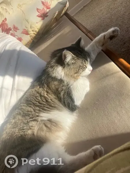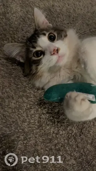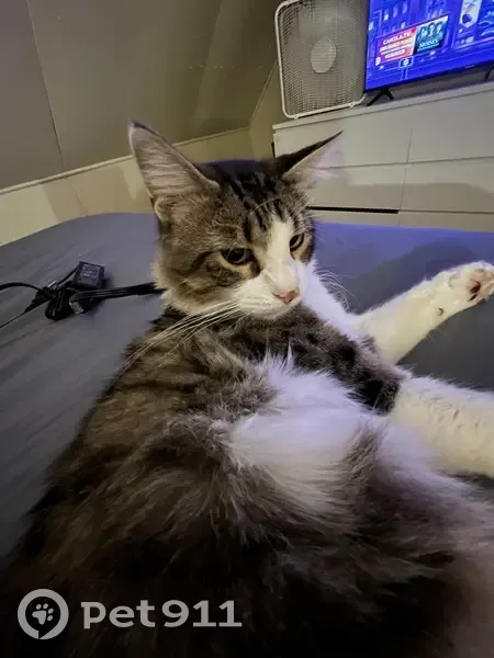 Astro is a big cat with fluffy fur and pointy ears. He is grey-ish/brown-ish and has a white belly, feet, and neck with black stripes on his body and very visible ones on his head. When he went missing he had a white flee collar on. He went missing after we let him outside…he is an outside cat a little bit but he doesn’t know the area well and that is how he got lost.
