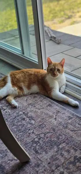 Orange wavy short hair Very friendly Responds to humans Not over fed and not under fed About 5 lbs and I would guess born in spring Unsure sex at this time No collar No tags Front and back claws
