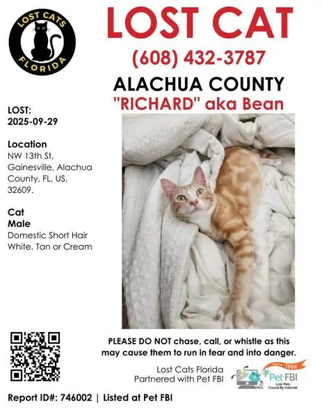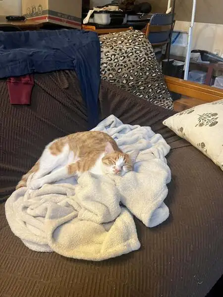 Orange and white cat, approximately 1 year old. Not microchipped and was not wearing a collar. It has a white stripe on the face and white paws. Very friendly and a bit shy
