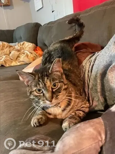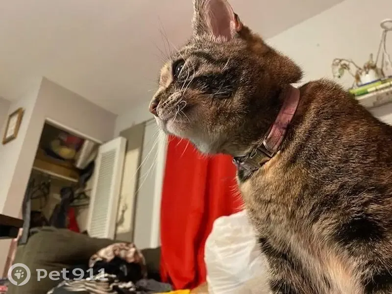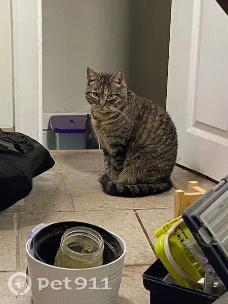 Striped gray tabby with traces of black, tan, and white in her fur. She has yellow-brown eyes and a salmon-colored nose. She has a clipped ear. She was last seen wearing her light purple collar with a silver-chrome latch that says "Latte" on it.