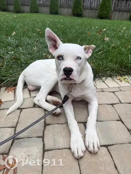 Bubs is a short hair, medium to large size dog. I suspect he is a pitbull husky mix. He is very timid and shy, particularly around men, but has not shown any signs of aggression. I received him last night (10/3) from another family who found him as a stray and could not keep him. He got spooked and slipped out of his collar, so he does not currently have one on. He is also not yet chipped.