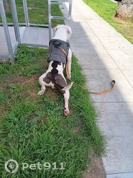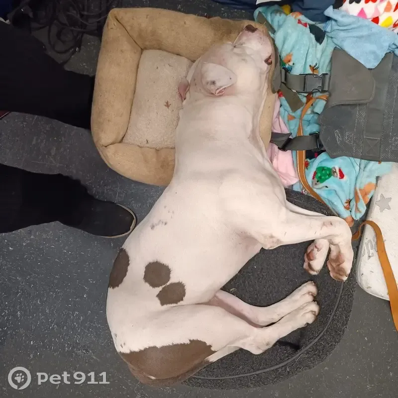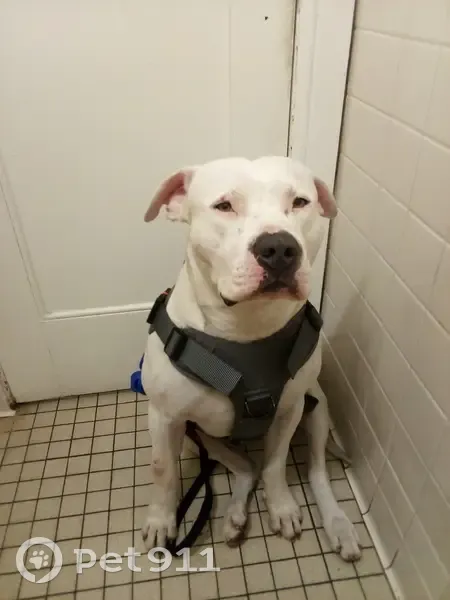 Blue nose pit bull white with grey markings on butt and back. Scarring on ear from dog bites. Very human friendly , but his face is scary to people who do not know him. He won’t attack humans. Alpha dogs he will attack. Loves to play catch. Very smart and sweet