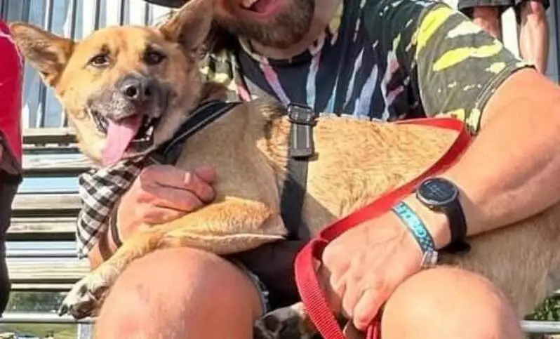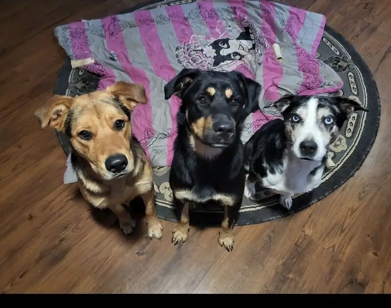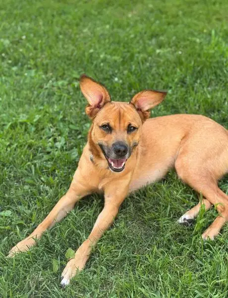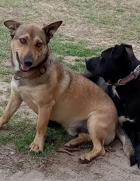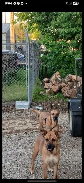 Two dogs, first one with short brown fur with black tips. Brown eyes and black snoot/nose. Approximately 25-30 lbs. Second one with ivory white fur. Brown spots on ears and right eye solid black & brown patch. Pink snout w black nose. Approximately 30lbs. - resembles an English setter. Loves foraging in woods. Found by arriving at our residence.