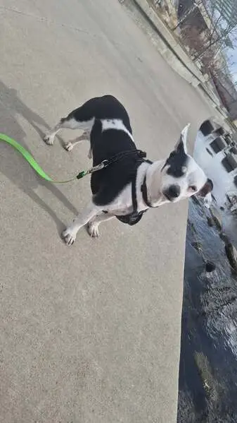 White with faint tan spots , scared, hungry, super friendly. Neutered and nails trimmed. Well mannered . Less than a year. Still squats to potty.
