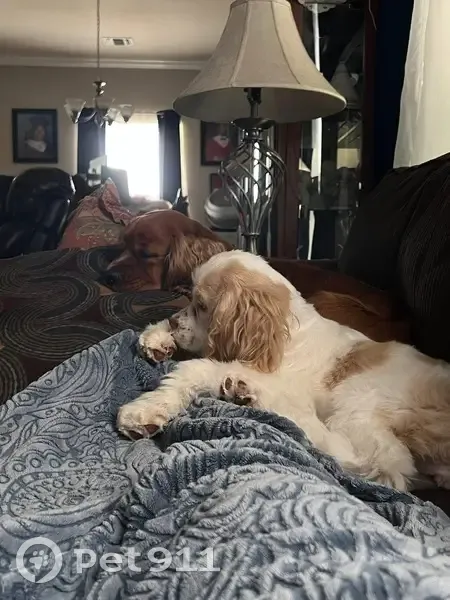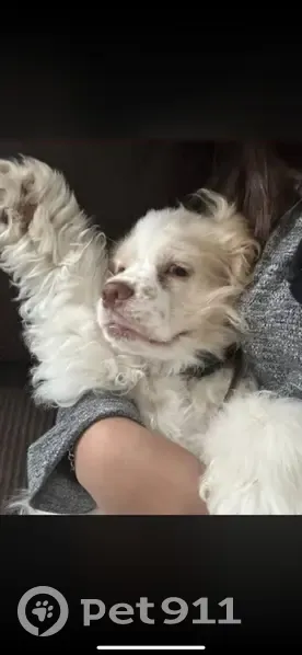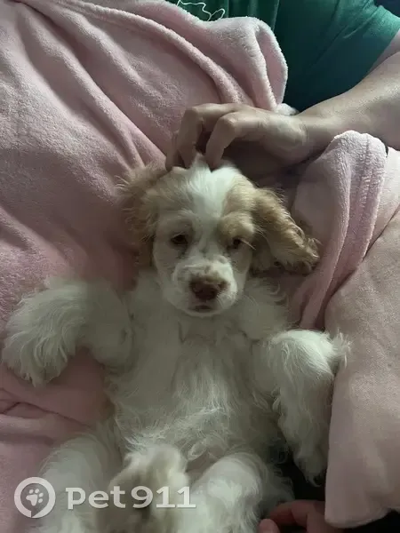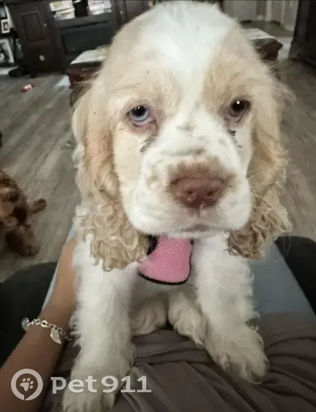 White and buff female Cocker Spaniel, 1 blue eye, 1 grey/hazel eye. Has a pink collar with her rabies and her name on it and it has my phone number on it.
