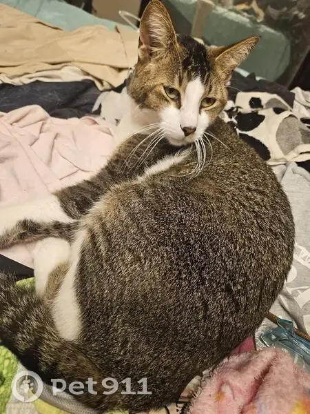Reward!!!!He has a mostly white stomach and mixed brown, black and gray back. He is vocal and mostly friendly and a hunter. He is loved by my special needs daughter who is barely eating with him gone.