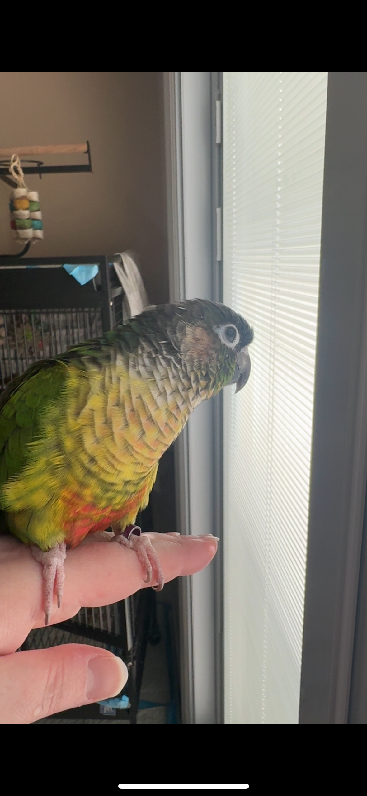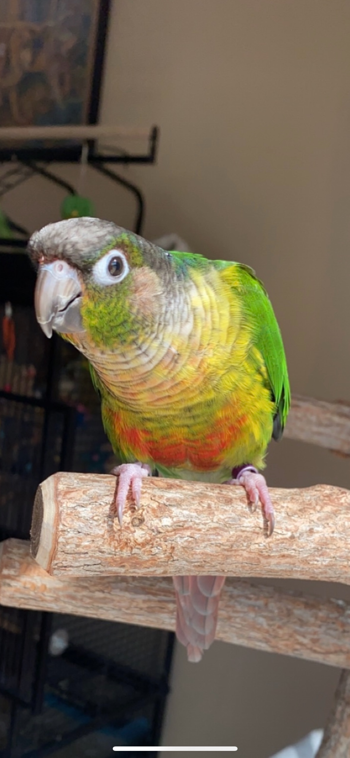 Birdie is a green cheek conure parrot that has mostly green feathers on her back, red and yellow on her chest, a red tail and dark gray feathers on her head. She also has a purple leg band on her left leg. Please help us bring Birdie home, we miss her so much!