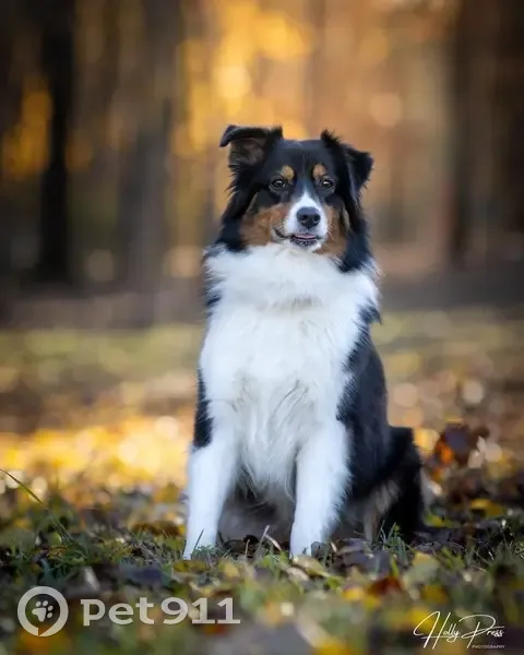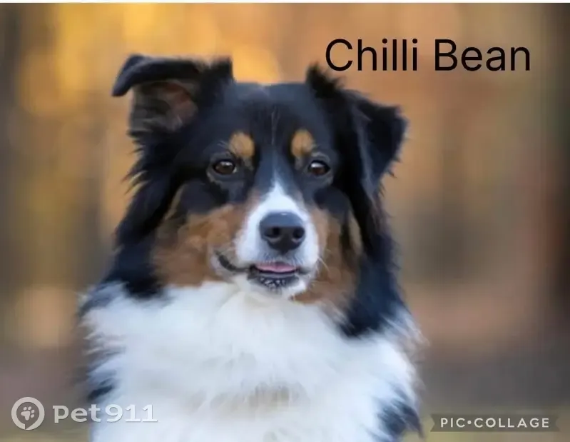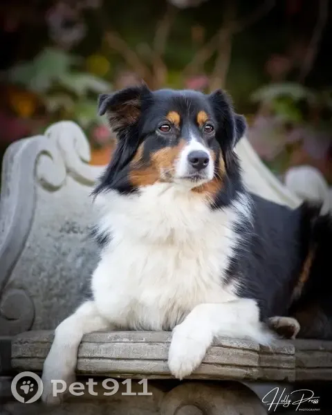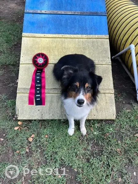 I was on vacation, had house sitter, but lawn service left gate unsecured. Black Tri Australian shepherd, red collar on when list, her name and my phone number woven into her collar