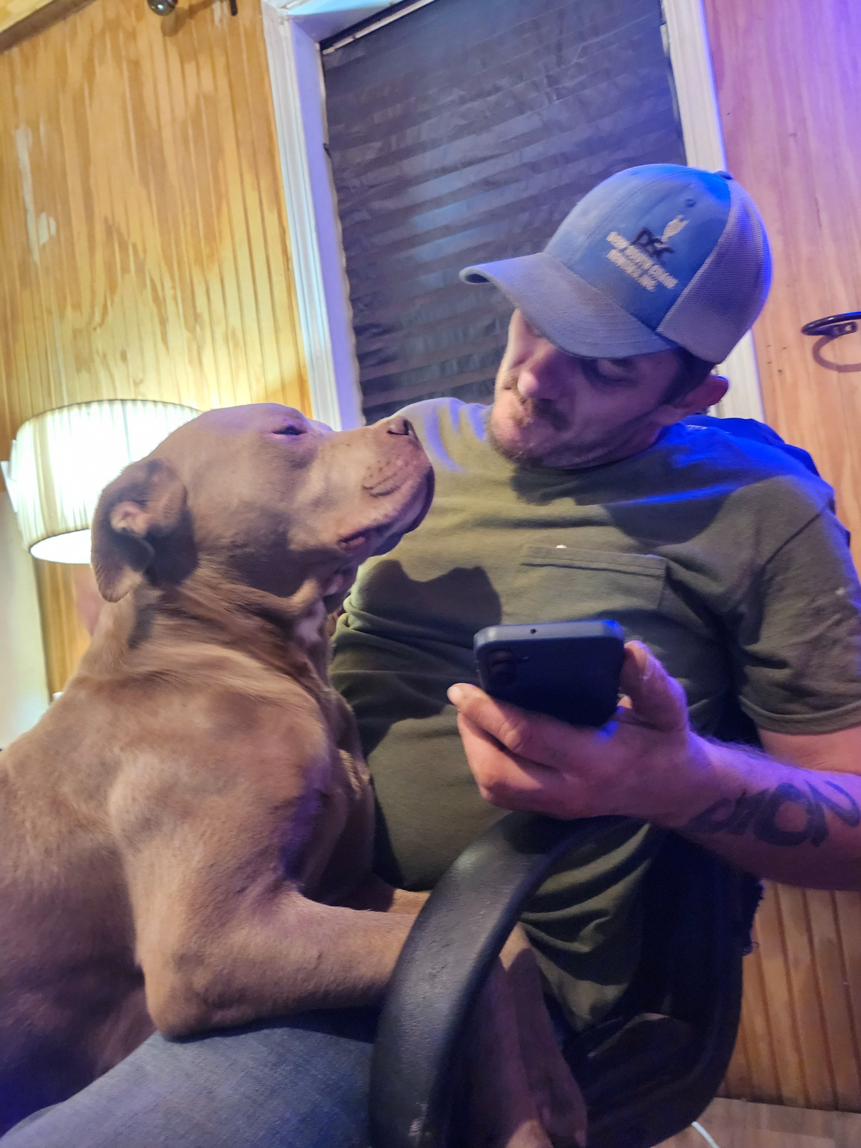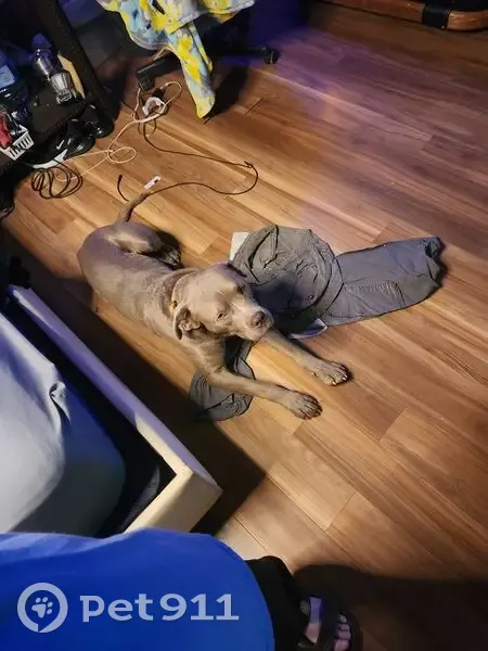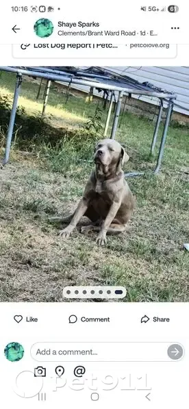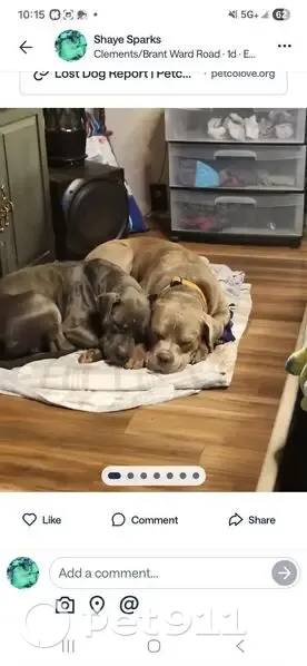 His coat is brown/grey, he has white mark down front of his chest. He was wearing an orange collar, he will smile at you if he knows you, he never has left home before so im not sure how he could respond to strangers but he barely barks at someone pulling in the driveway..