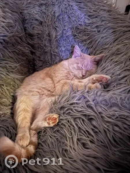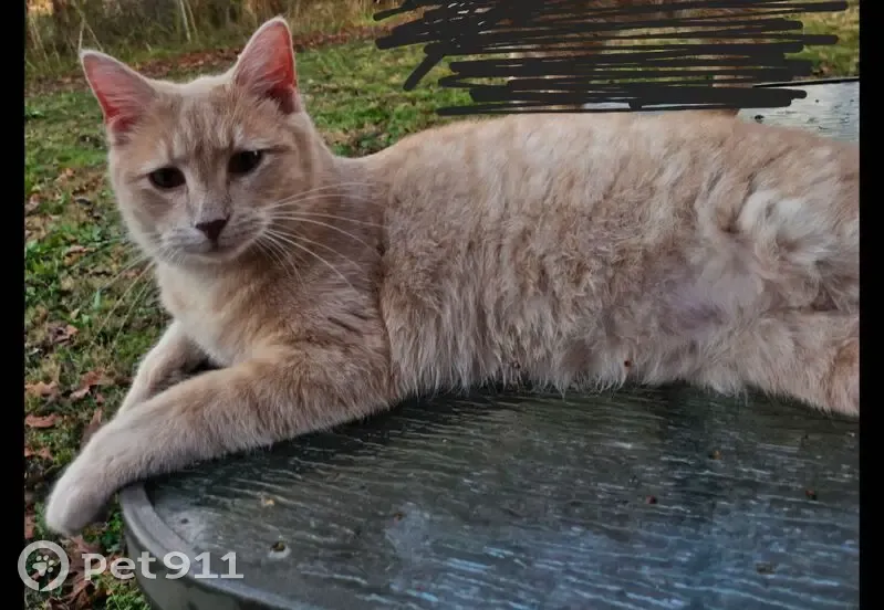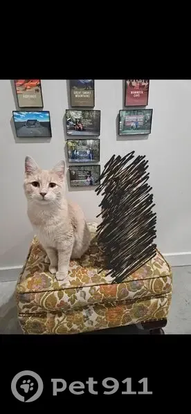 He is a light orange/cream cat with faint stripes his eyes are a little weird he is usually sweet and will come up to you if you call him kitty kitty kitty but since hes lost in a new area im not sure how he will be he likes other cats but not dogs