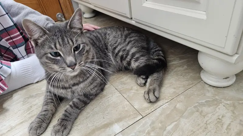 Tabby colored between eight and 12 years old she was a catch and release so she has half an ear and it’s fixed. She’s not a fan of being picked up or other animals but to human she’s super sweet.