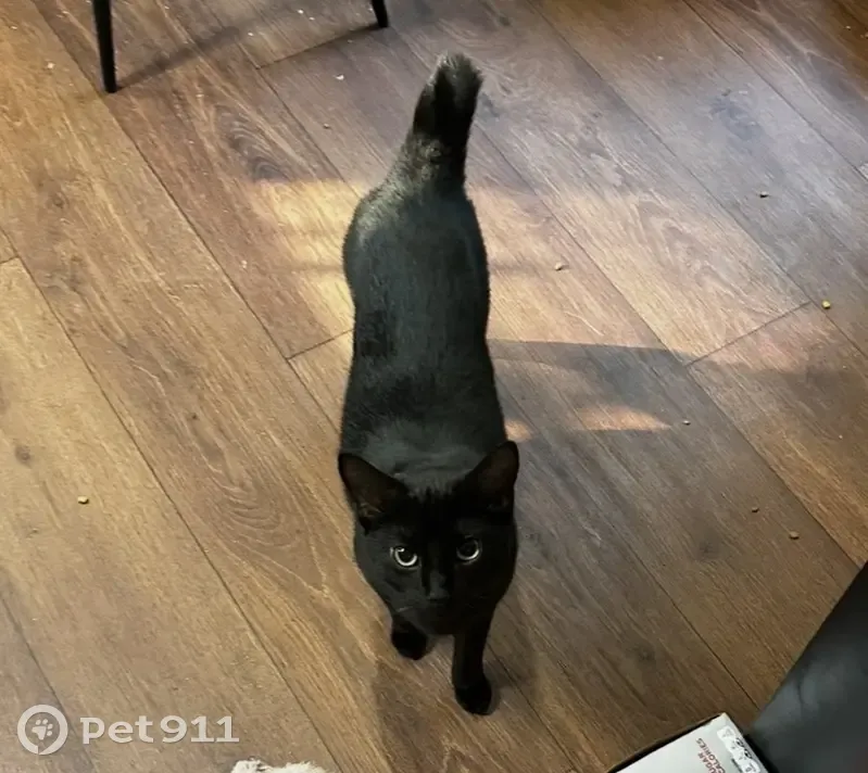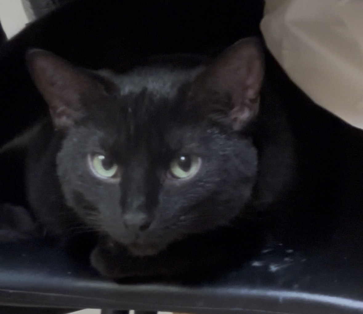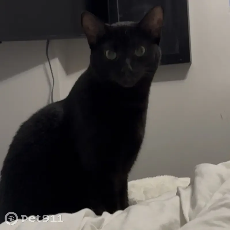 He has half of a tail, all black with some white whiskers. Bright green eyes. He’s afraid of outside so he will probably be slinking and hiding under something. He has a very little meow that is “girly”. We call him boogie or oogs.