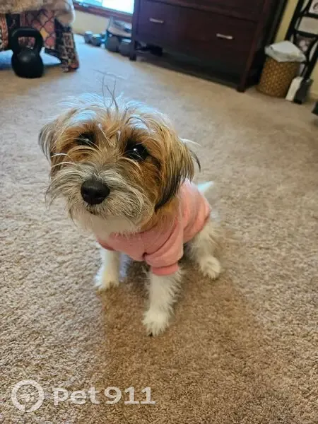 White and tan 12 lb fluffy Jack Russell Terrier. She is only 10 mths old. We were traveling and stopped at Royal Farms in Dagsboro and took her out back to pee. A dump truck slammed the garbage dumpster down and frightened her. She ran fast up 113 and wouldn't stop. We search for 5 hours and the searched again. We got a hotel so we can be here for her. All help is appreciated.