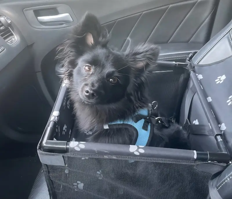 Female small black dog with a white tuft on its chest found near the Northaven trail. She might be a puppy, roughly 25 lbs is my guess. She's sweet but scared.