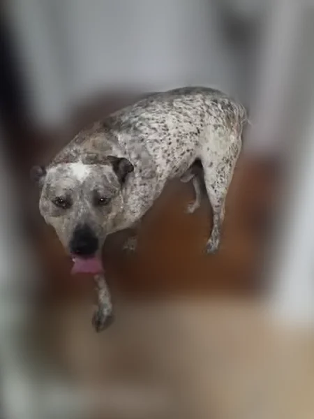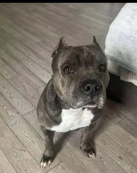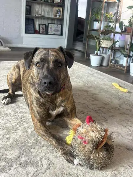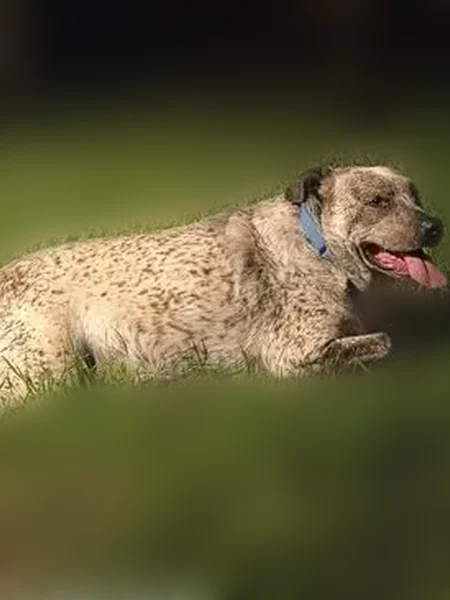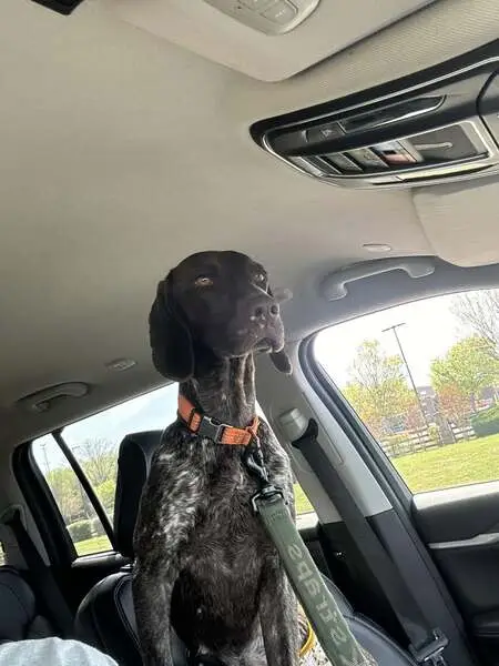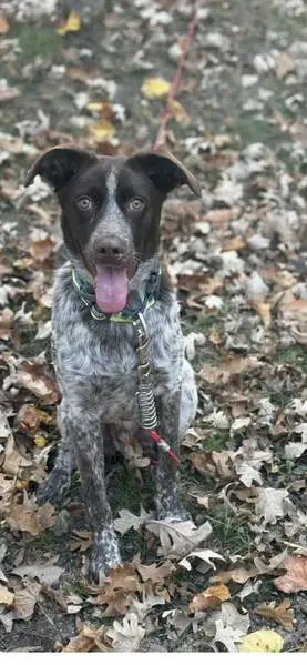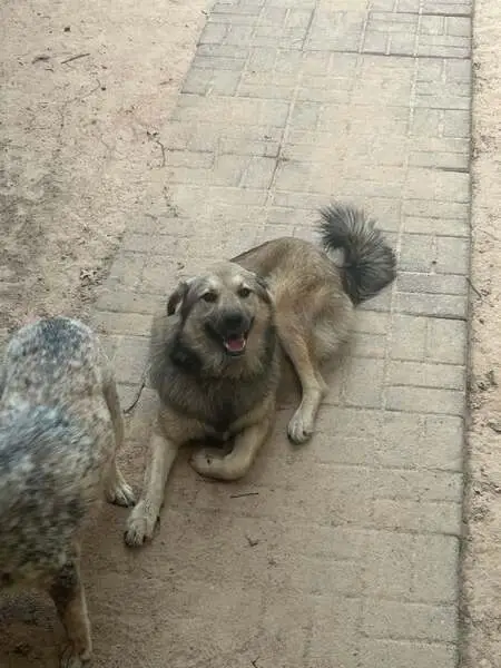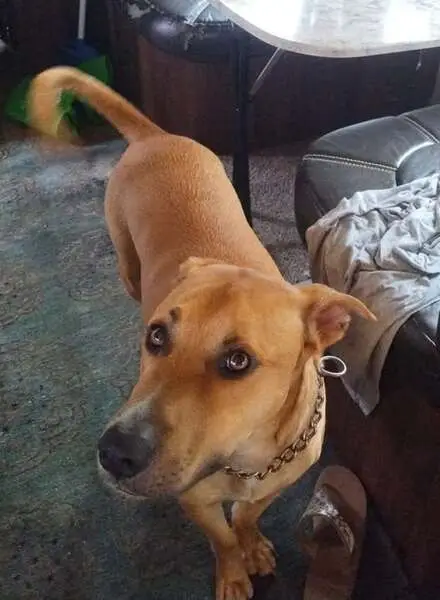 Very friendly, seems well kept and domesticated. Probably 75+ pounds, male, wearing blue collar but no tag. He walked right up to keep once I pulled over, calm demeanor.
