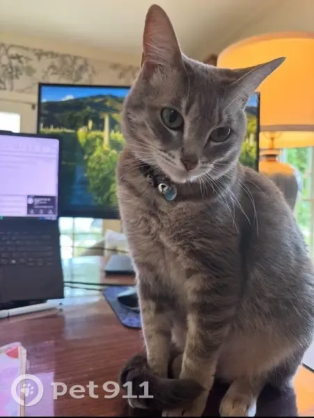 She is a grey cat that is pretty small for a 2 year old cat. She is pretty nice and won’t bite if you find her. She has the collar on that she has in the pictures. She is chipped.