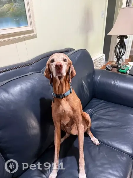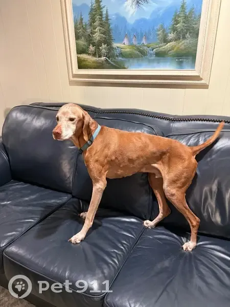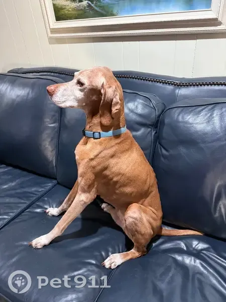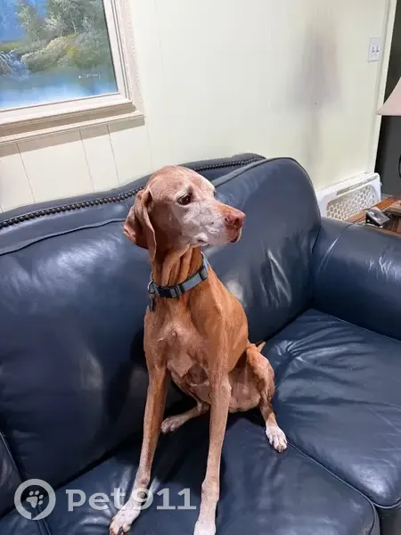 He’s a Vizsla with a reddish/tan coat. There’s gray around his muzzle and chest. He’s very timid and skiddish until you get to know him. For a Vizsla he’s pretty calm. He got out a side gate around 8pm. Believe he was chasing a cat per a neighbor. I briefly saw him but a clap of thunder and he took off running at full speed. He has a blue collar with rabbies and name tags. Weighs roughly 50 lbs. Does have multiple lipomas.