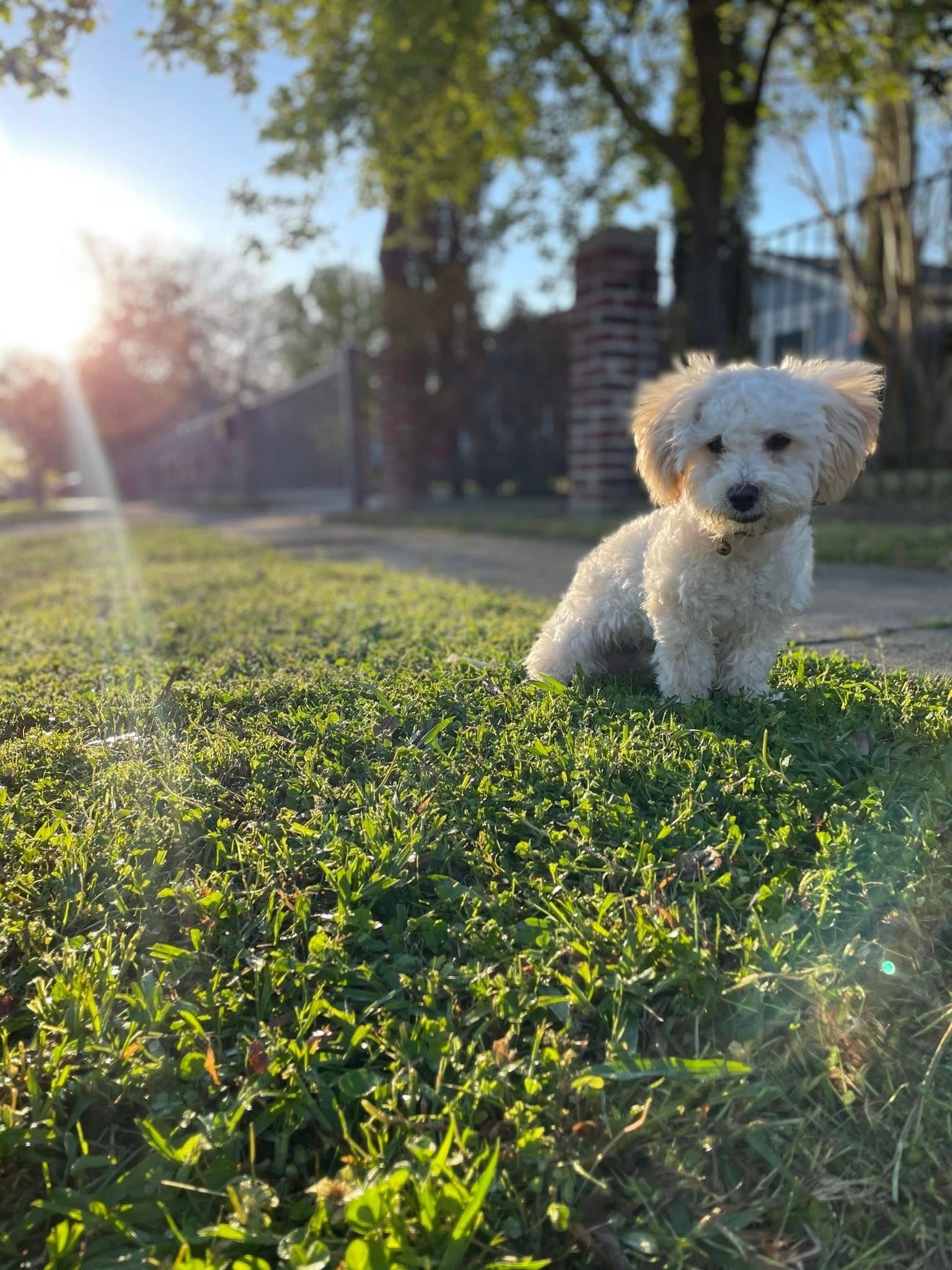 He is a white and beige dog, has some orange spots on both his front feet, he also has a very noticeable underbite ( you can see his under teeth poke out.