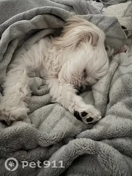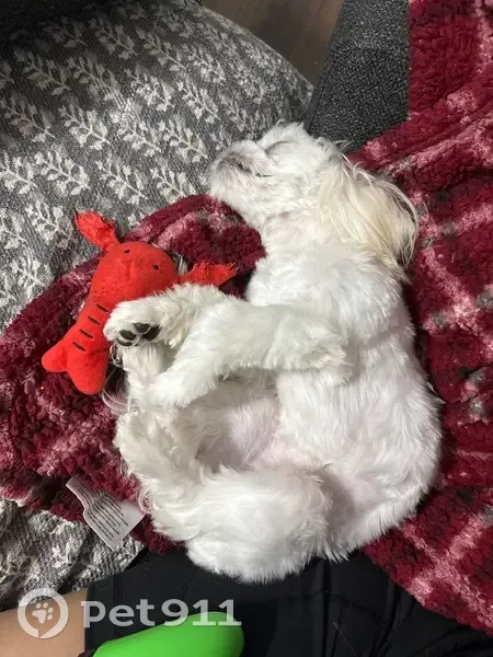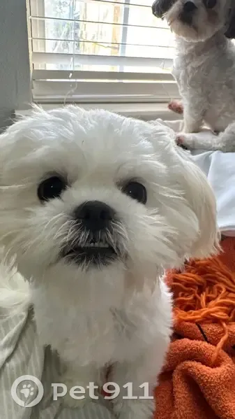 She’s white with some light brown , she was due for a groom service so her hair is longer than usual and matted hair by her ears ; shes 9 months old , and she’s not fixed or chipped