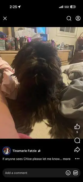 Katiemae is a black Shih Tzu 9 years old. Has a heart condition and takes medication. She jumped out of the truck in our yard and ran off and we were unable to get her. She’s precious and lovable.