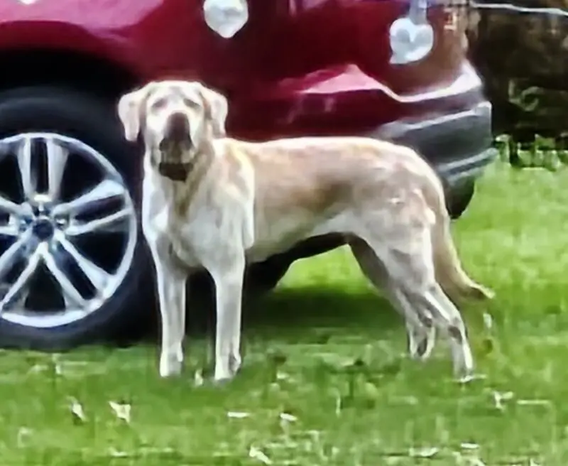 Update: Returned safe to home. Kalaya ( LAYA OR LAYLAY FOR SHORT), female, pink collar (no tag it few off ), very friendly, loves kids. We let her out at right about 6 pm on 7/28 and we went to let her in at right about 6:15 she was not there. She never leaves the yard. She is 9 years old.