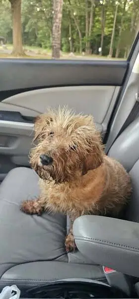 Blonde/tan in color Schnauzer/Terrier mix Fluffy tail; 13 pounds. A black raised mole on her bridge of nose. She jumped off of our deck through a small gap between the deck and the trailer. Guessing she was after a bunny