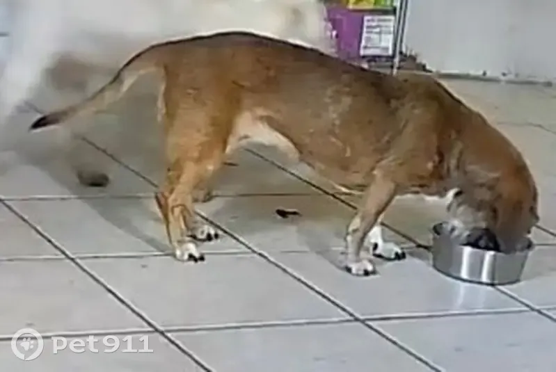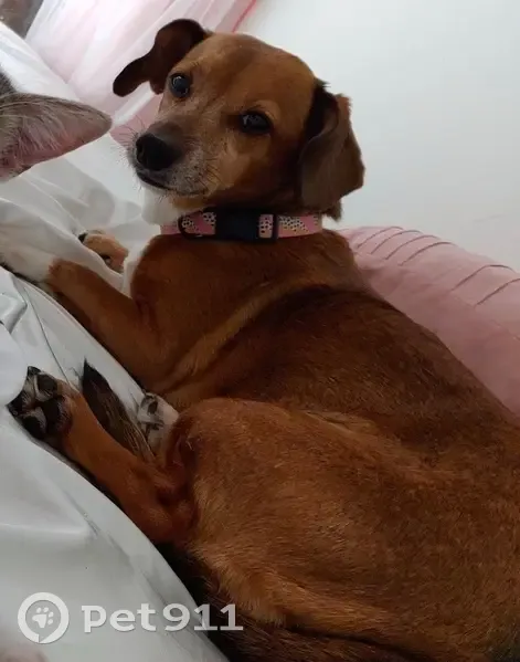 Brown with white paw and chest, she’s old so her face is gray and she’s pretty skinny. We think she got out from a loose fence, usually if she gets out she stays at the house.