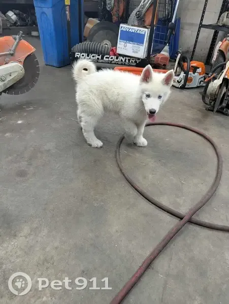 This dog wandered into my fiancés work shop and we were unable to locate an owner among nearby houses. They are all white with ice blue eyes and a curled tail. Collar with no tags, very friendly.