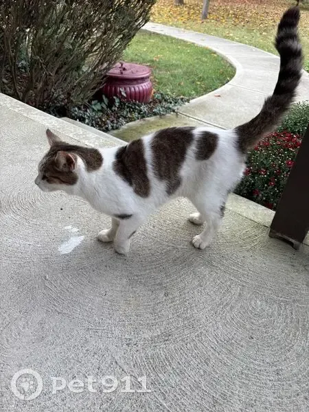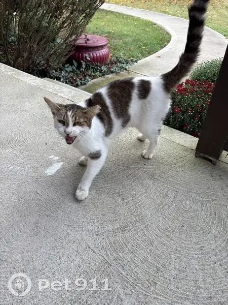 Very Vocal - crying to come inside. Very Friendly - allows me to pet it, follows me around, wants in my house. Racoon Tail pattern. Showed up on my front porch this afternoon. Has a clipped ear so it is spayed or neutered. Hungry & happy to eat dry food provided. I believe it is a female. I haven't picked up to investigate. Appears clean & well cared for. Lost or abandoned quite recently.
