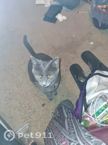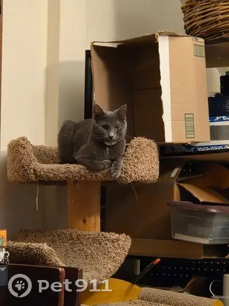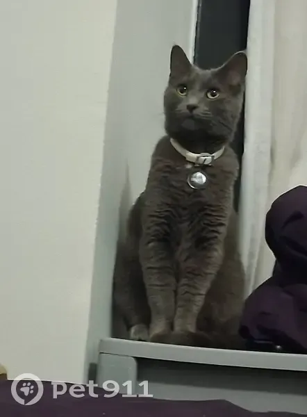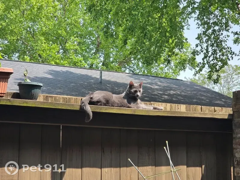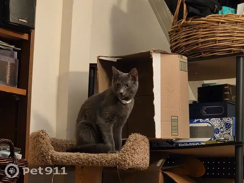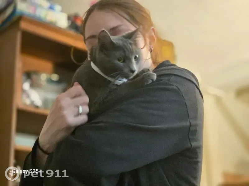 Small grey female cat, small white tuft on chest, flea collar with pawscout tag, skittish- will run if chased, loves to climb, very loving once comfortable. Does not respond to shaking treats or food, but does respond to can opener sounds. Loves canned chicken and Jerky treats. :)