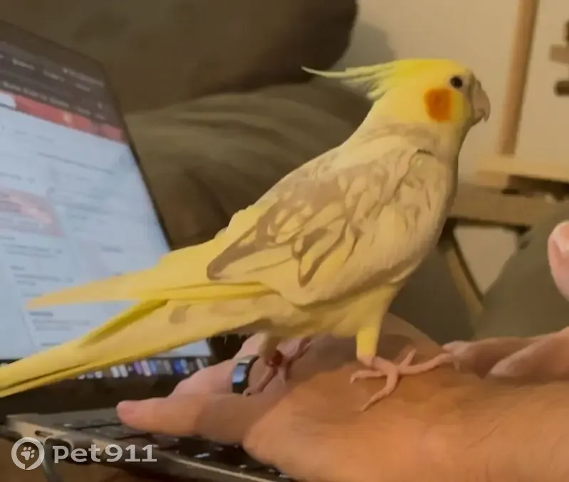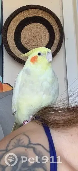 Yellow cockatiel with orange cheeks and light gray coloring on wings and red ankle bracelet. VERY friendly and loving. He will chirp/whistle when his name is called. If he is close enough and you call his name & hold out your hand he may fly to you. If youre close enough hell step onto your hand. He loves people and being on your shoulder. We last saw him flying in the direction of the Kings Point community off of Sims road in Delray Beach FL If spotted please try to safely catch him (if possible)
