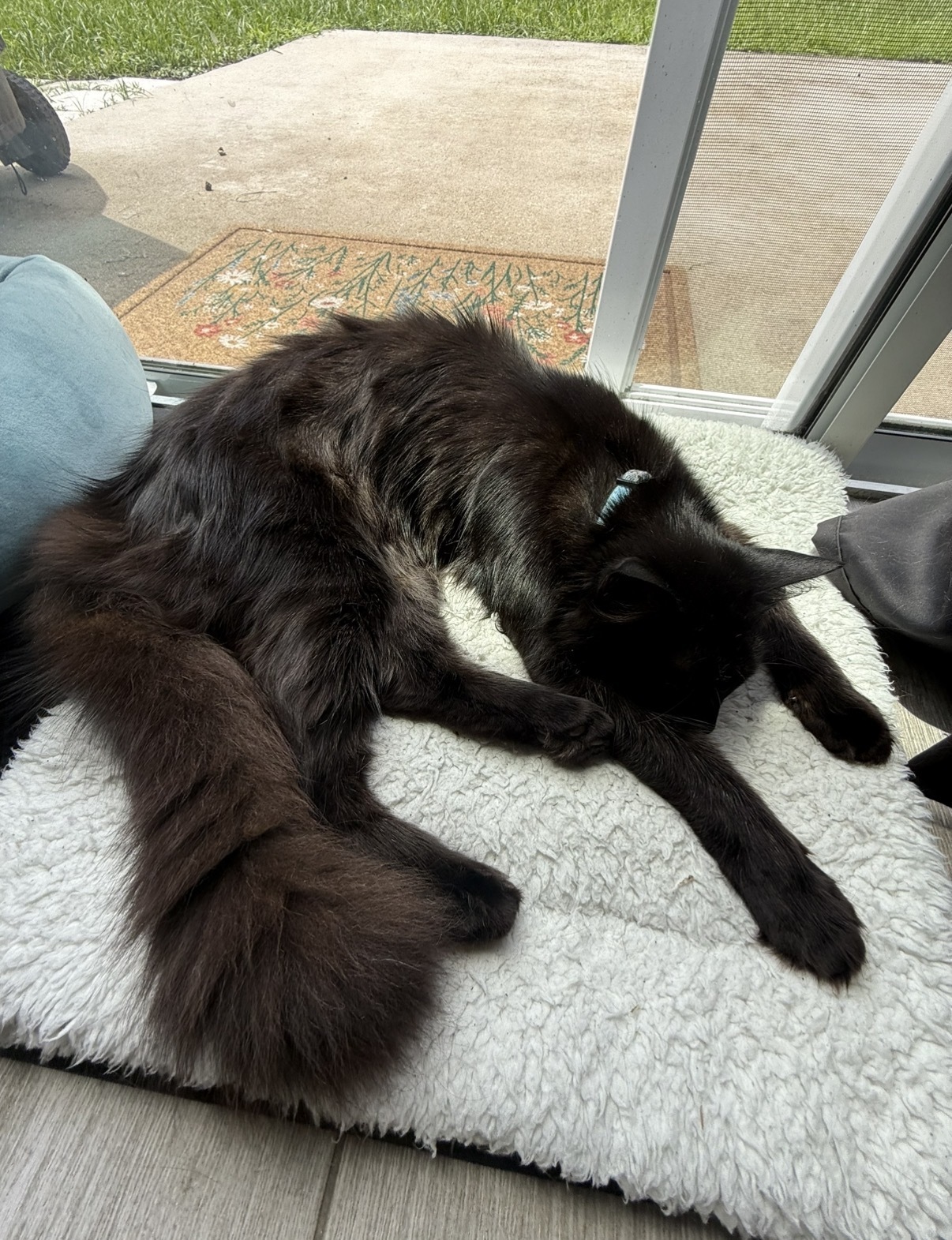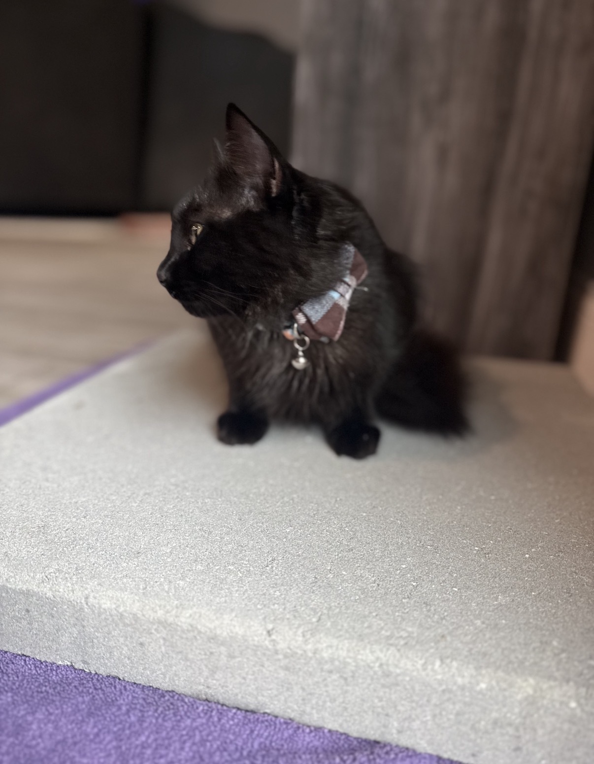 Wiggy has a fluffy black coat with a bushy tail. He has a white dot near his left eye. As well as a blue and brown bow tie collar. He is very friendly!