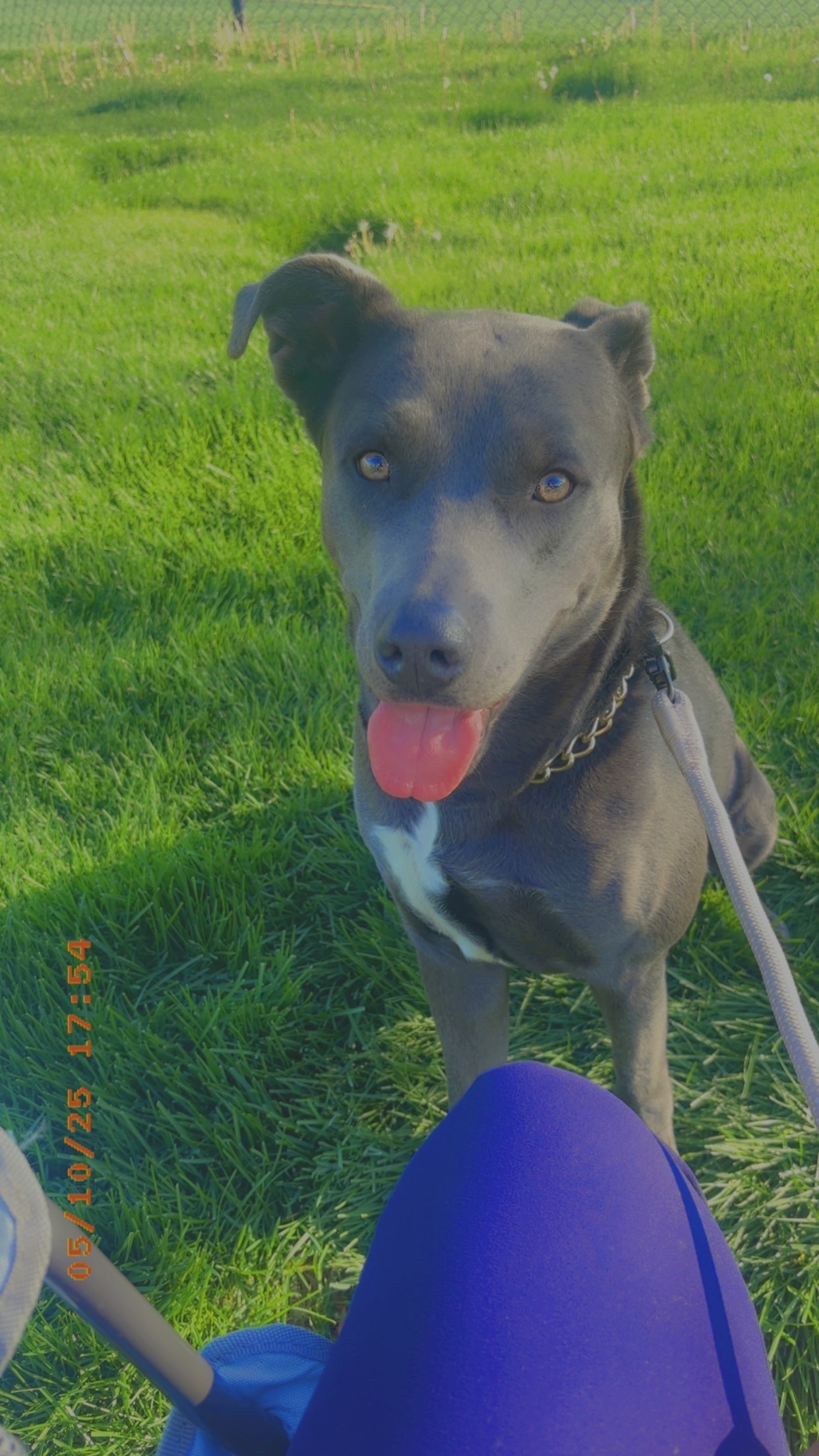 Grey pitski with white strip on chest and paws. Renia has brown eyes and a gold chain around her neck.Renia got out of the front yard