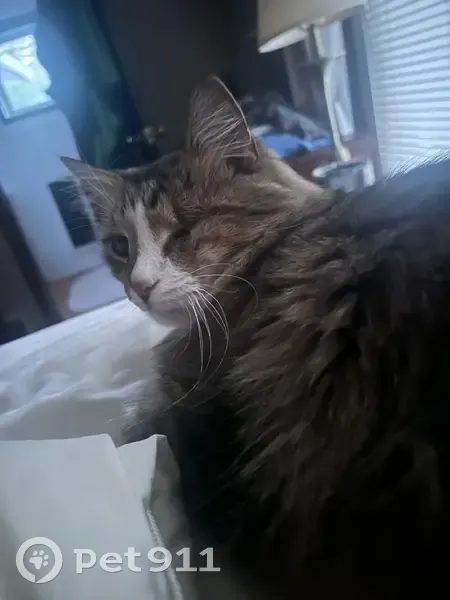 Diddy has only his right eye. He was not wearing his collar at the time. He is a fixed and chipped indoor/outdoor male medium hair tabby. He is pretty timid-probably won’t approach people and certainly not men. He is normally home daily like clockwork having only disappeared a few times in the 6 years I’ve been blessed to love him and has never stayed gone this long. He is very loving and smart and an avid hunter!