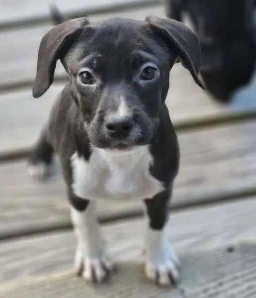 6 month old terrier mix with a Black face white body with black patch on back and near her tail. Approximately 20-25 lbs. She has a red christmasy collar, a red plaid harness, and a lite sage green leash, all still attached to her. She bolted out of the car when we got home before anyone had a handle on her leash. She has one floppy ear and one that stands straight up. Very timid